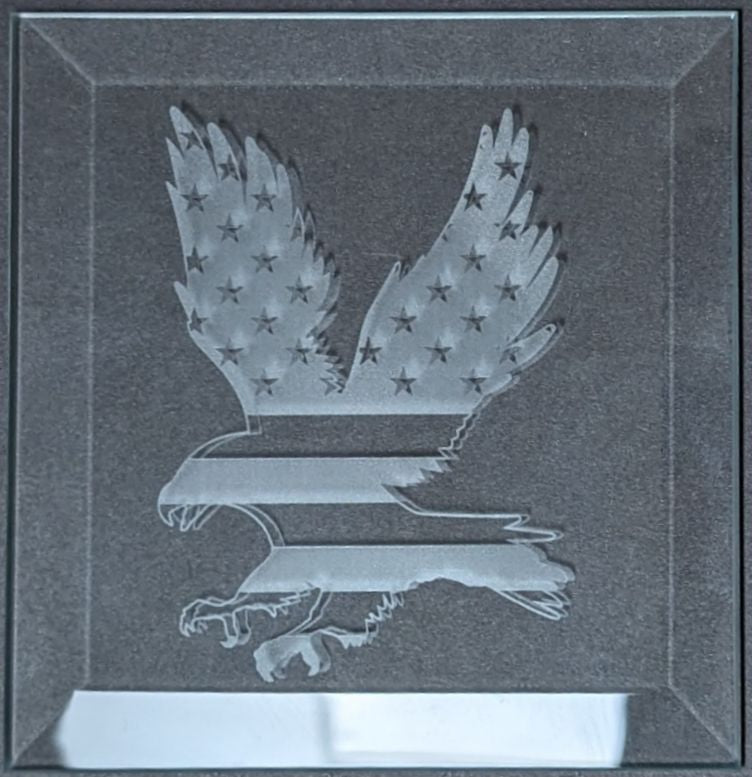 This glass bevel is precisely laser-engraved for a bright, eye-catching look. Available in 4"x4" and 5"x5" squares and 4" and 5" diameter circles.