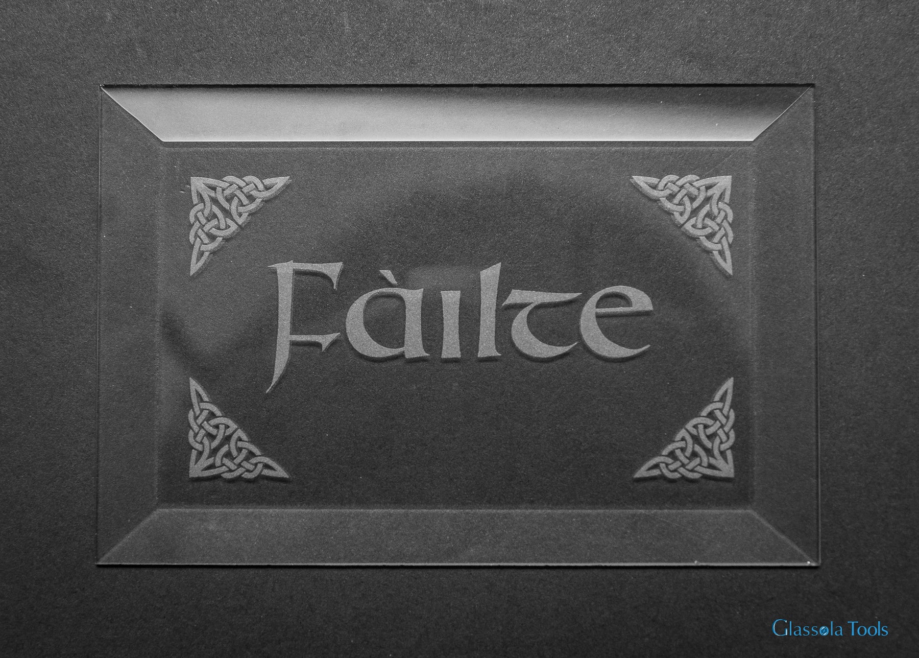 A beautiful sentiment to add to a cheerful panel, this laser-engraved glass bevel says "Fáilte" - the Gaelic word for "Welcome". Accompanied by beautiful a Celtic knot motif, this can make an attractive centerpiece for a panel or suncatcher.