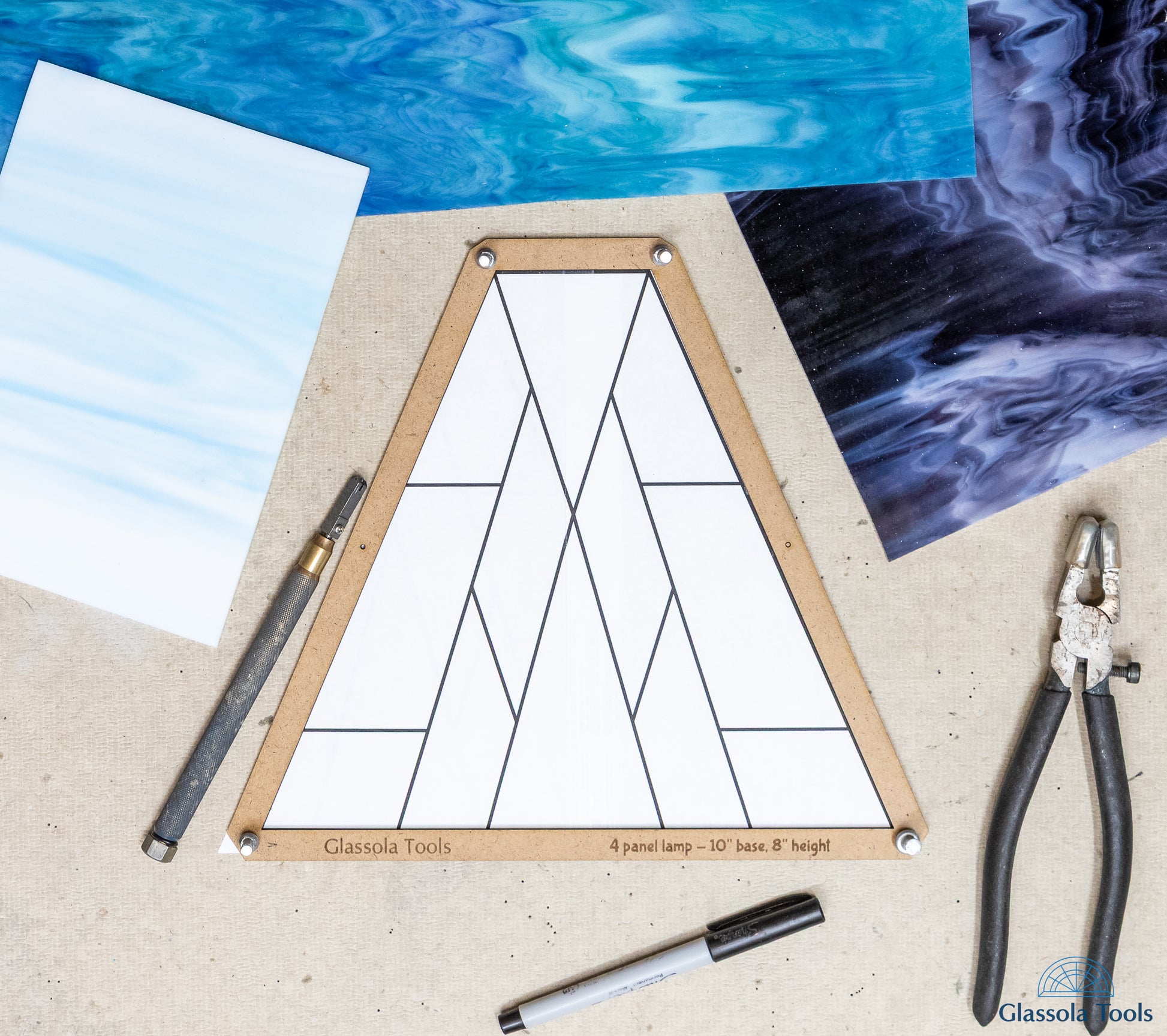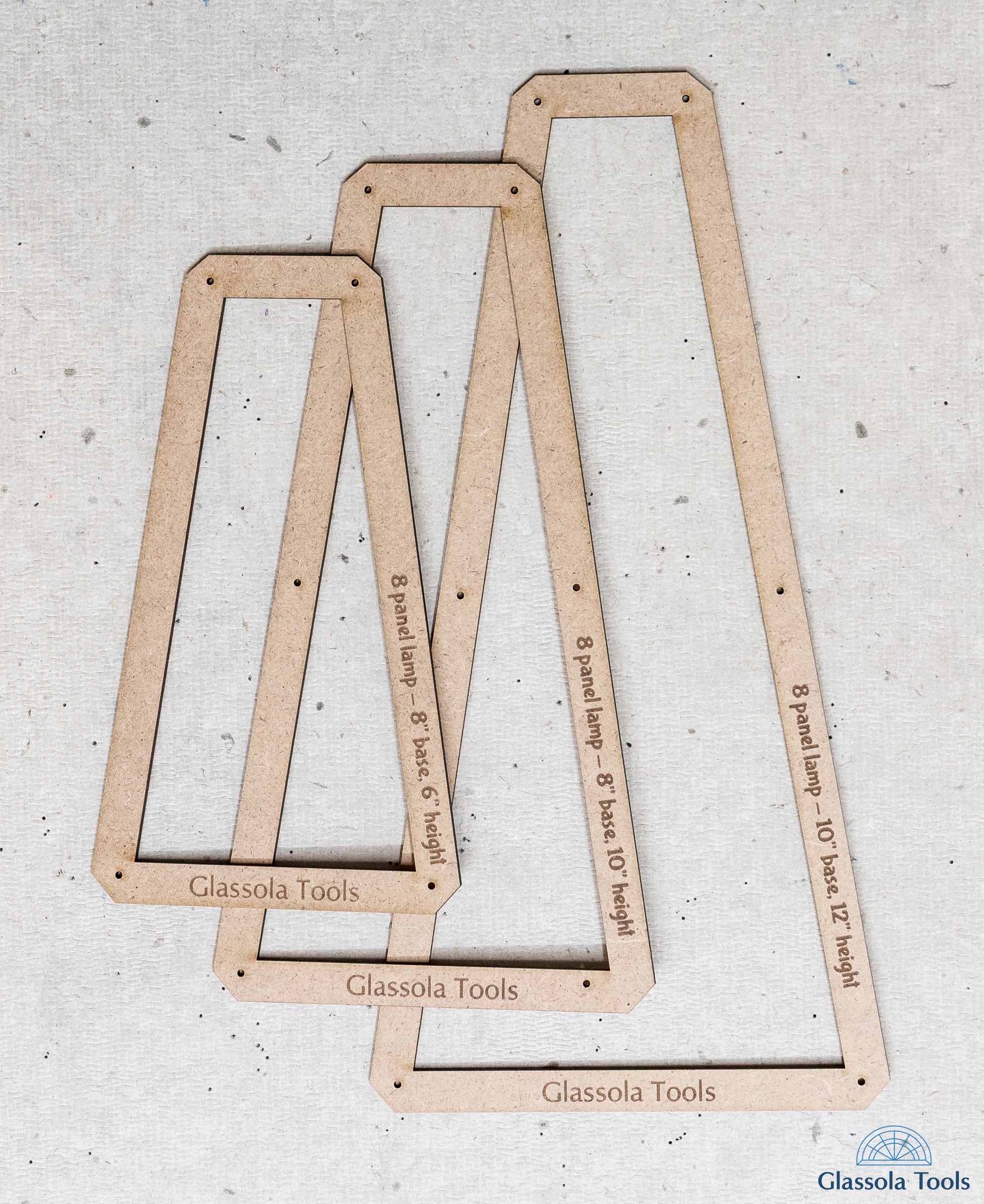 We've calculated all the measurements and angles for you in advance. All you have to do is pin the frames to your workboard, and create panels that are exactly the right size and shape. Then you can solder the edges together to make a wonderful stained glass lampshade!