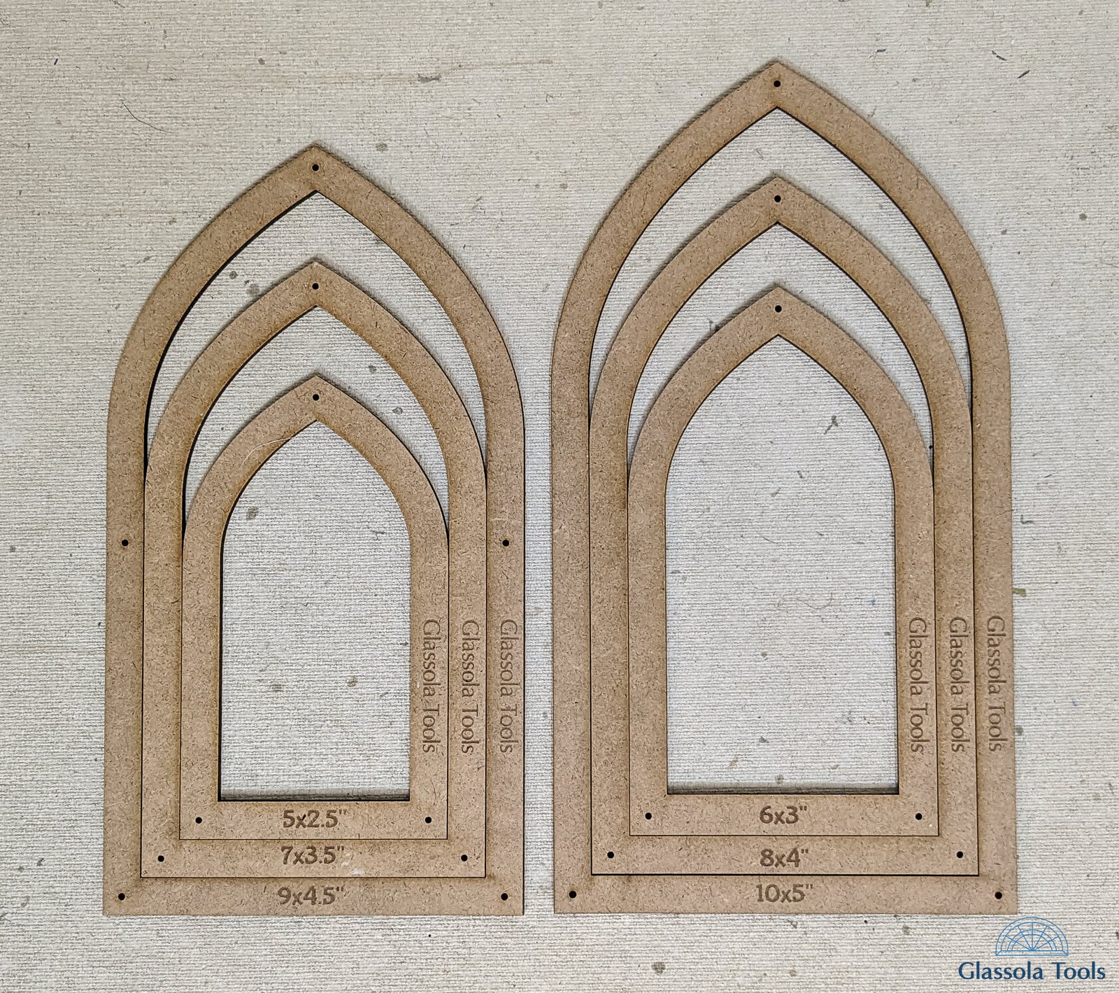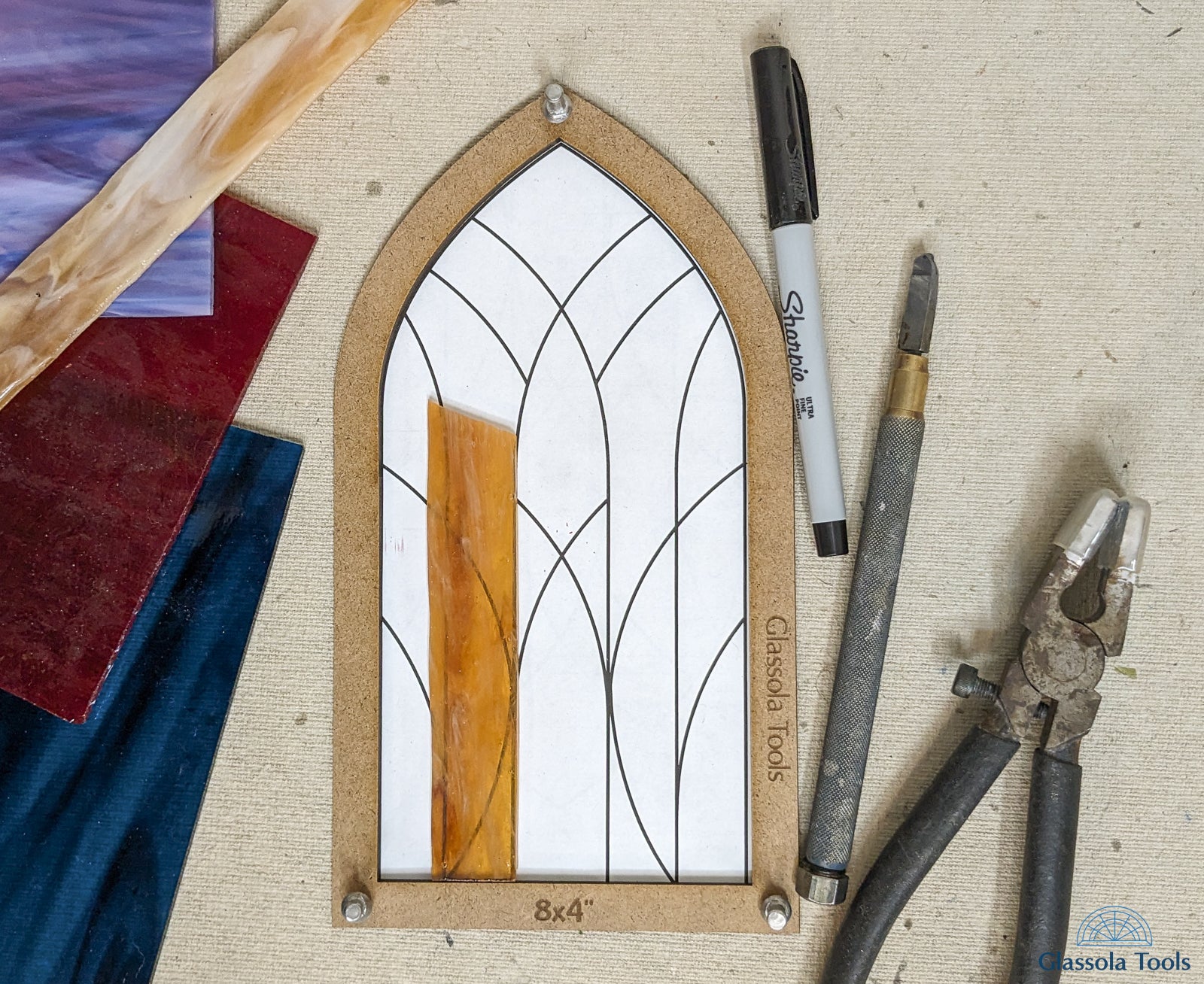 Now you can make arched windows with perfectly straight sides, a precise, even curve, and an exact point with the pointed arch layout frames from Glassola Tools!